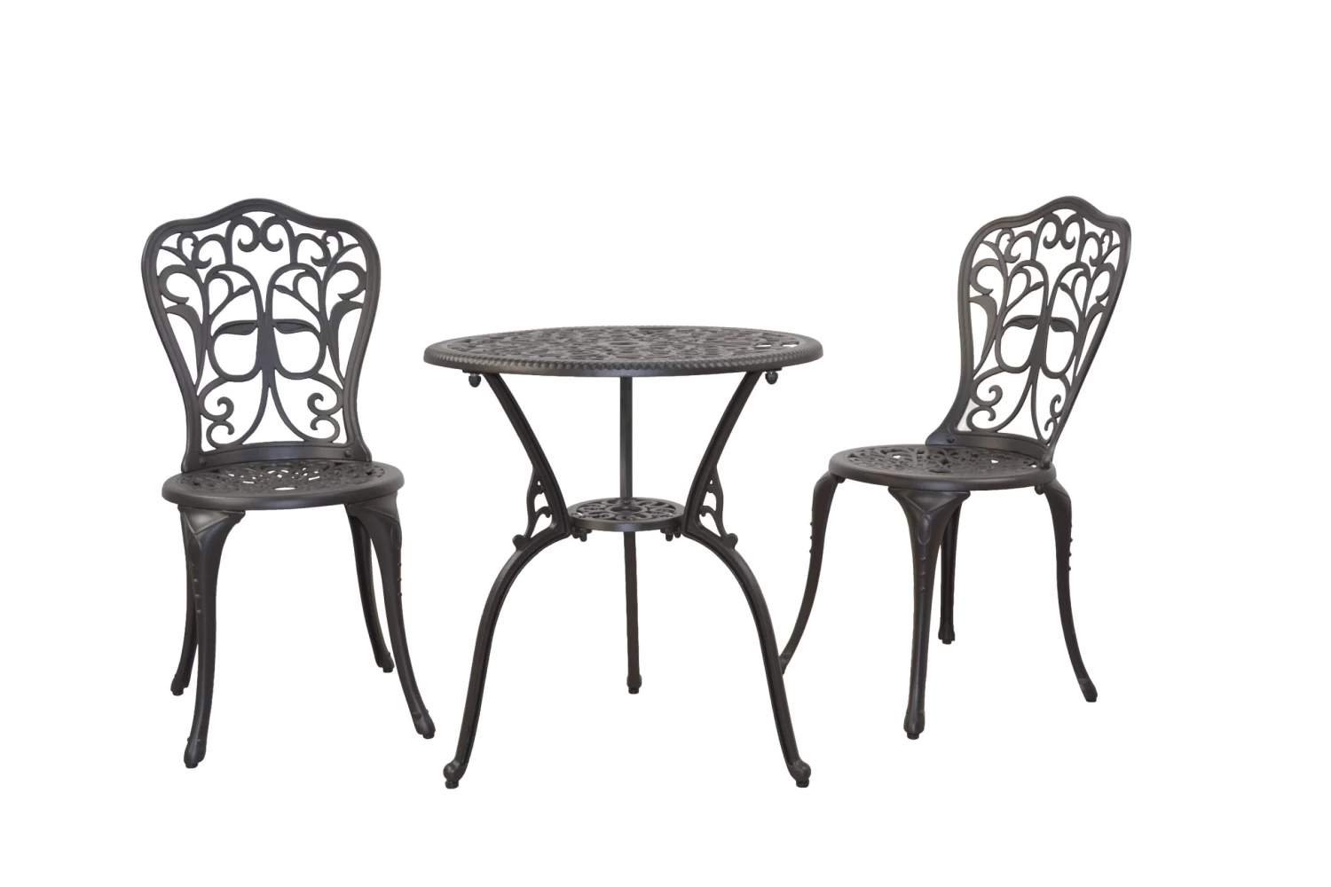 Die elegante und wunderschöne Gartenmöbel-Serie „Versailles“ ist aus Aluminiumguss gefertigt und in dunkelbraun erhältlich. Die zwei Stühle und der runde Tisch sind ein toller Blickfang auf ihrer Terrasse, Balkon oder im Garten. Das Aluminiummaterial zeichnet sich durch seine Leichtigkeit bei gleichzeitig großer Stabilität aus und wird sie begeistern. Maße je Stuhl: B. 42 x T. 49 x H. 89 cm. Sitzhöhe ca. 42,5 cm. Tisch ca. cm: Ø60 x H. 66 cm. Möbel werden im Paket flach verpackt angeliefert, mit Aufbauanleitung.