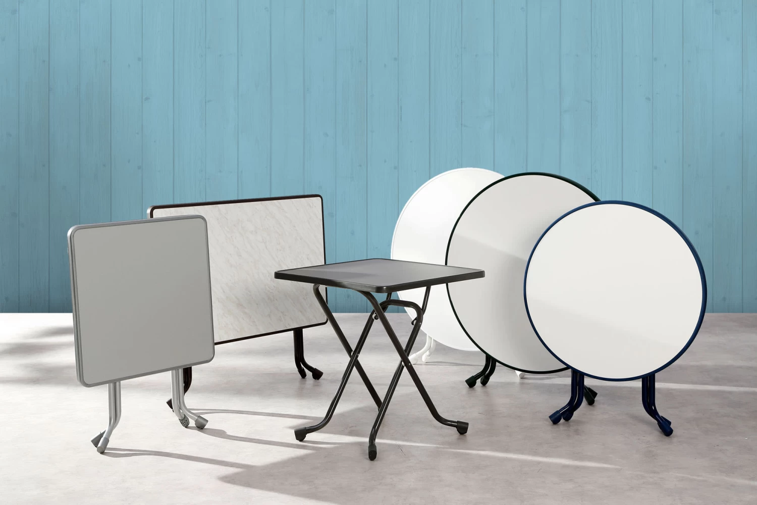 Der Scherenklapptisch Primo besteht aus einem robusten Stahlrohrgestell mit einem praktischen Scheren-Klappmechanismus. Die wetterfeste und U.V. bestĂ€ndige Tischplatte ist belastbar, kratzfest und hitzebestĂ€ndig. Mit zusĂ€tzlich farblich auf das Gestell angepasstem Schutz-/Kunststoffumleimer an der Tischplatte. Der Tisch ist mit wenigen Handgriffen zusammenklappbar und lĂ€sst sich platzsparend verstauen. MaĂe: rund 80 cm Ă / Tischhöhe: 70 cm
