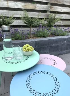 Die runde Form des Tisches sorgt dafĂŒr, dass er in viele Umgebungen im Garten oder auf der Terrasse passt.