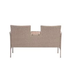 Zwei Sitzplätze – ein Möbelstück: Wer es sich gerne zu zweit gemütlich macht, ist mit der modernen 2-Sitzer-Bank bestens beraten. Das stylische Accessoire für Outdoor- und Indoor-Bereiche begeistert mit seinem mittigen Lattentisch aus Eukalyptusholz FSC® 100 % sowie seiner geringen Größe. Nur ca. 144 x 87 x 65 cm misst die Sitzgelegenheit, die hervorragend auf dem Balkon, der Dachterrasse und vor dem Gartenhäuschen zur Geltung kommt. Kreativ: Im Innenraum aufgestellt macht der Sitz jede Ecke zum besonderen Highlight – z. B. als Fernseh- oder Lese-Bank. Weitere Vorteile sind das stabile Stahlgestell sowie das widerstandsfähige, braune Polyethylengeflecht. Die pflegeleichte Alternative zu Naturrattan punktet mit ihren schmutz- und wasserabweisenden Kunststofffasern, die eine gute Beständigkeit gegen Witterungseinflüsse und UV-Strahlung aufweisen – für eine natürliche Optik und lange Farbintensität. Ausgestattet ist das Möbel außerdem mit grauen Kissen aus 100 % Polyester, die für mehr Komfort sorgen. Die maximale Belastbarkeit beträgt 2 x 110 kg. Hinsetzen und wohlfühlen.