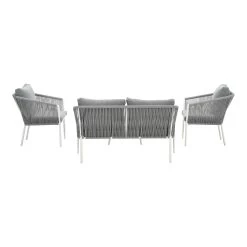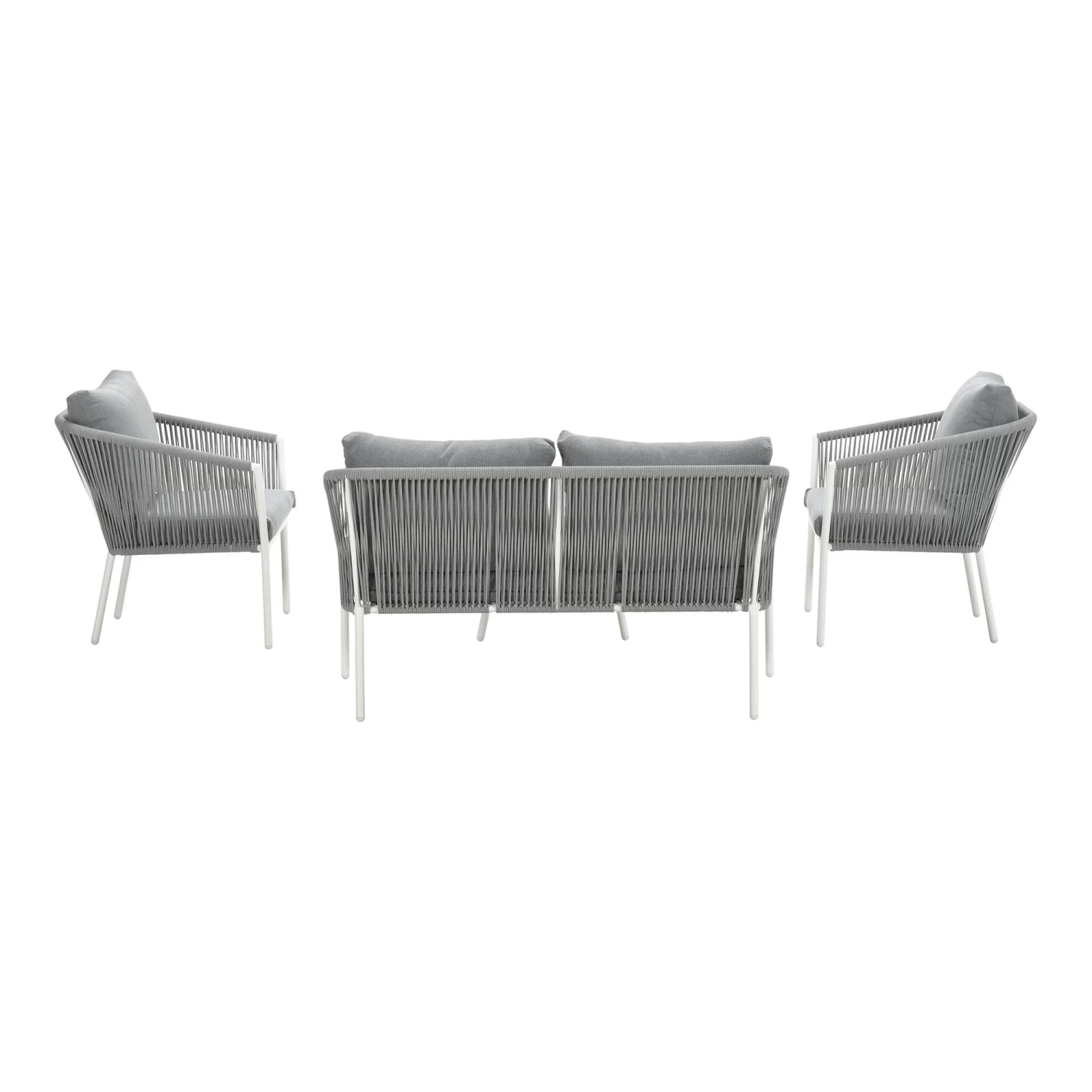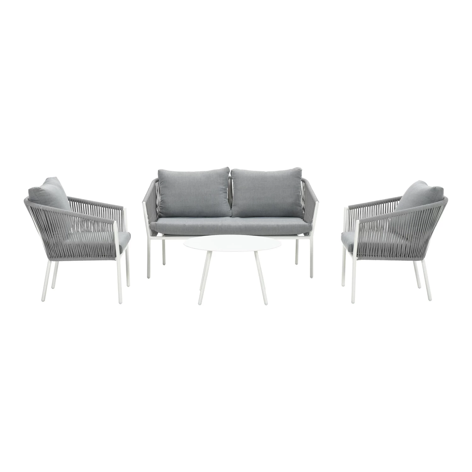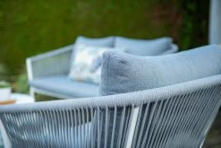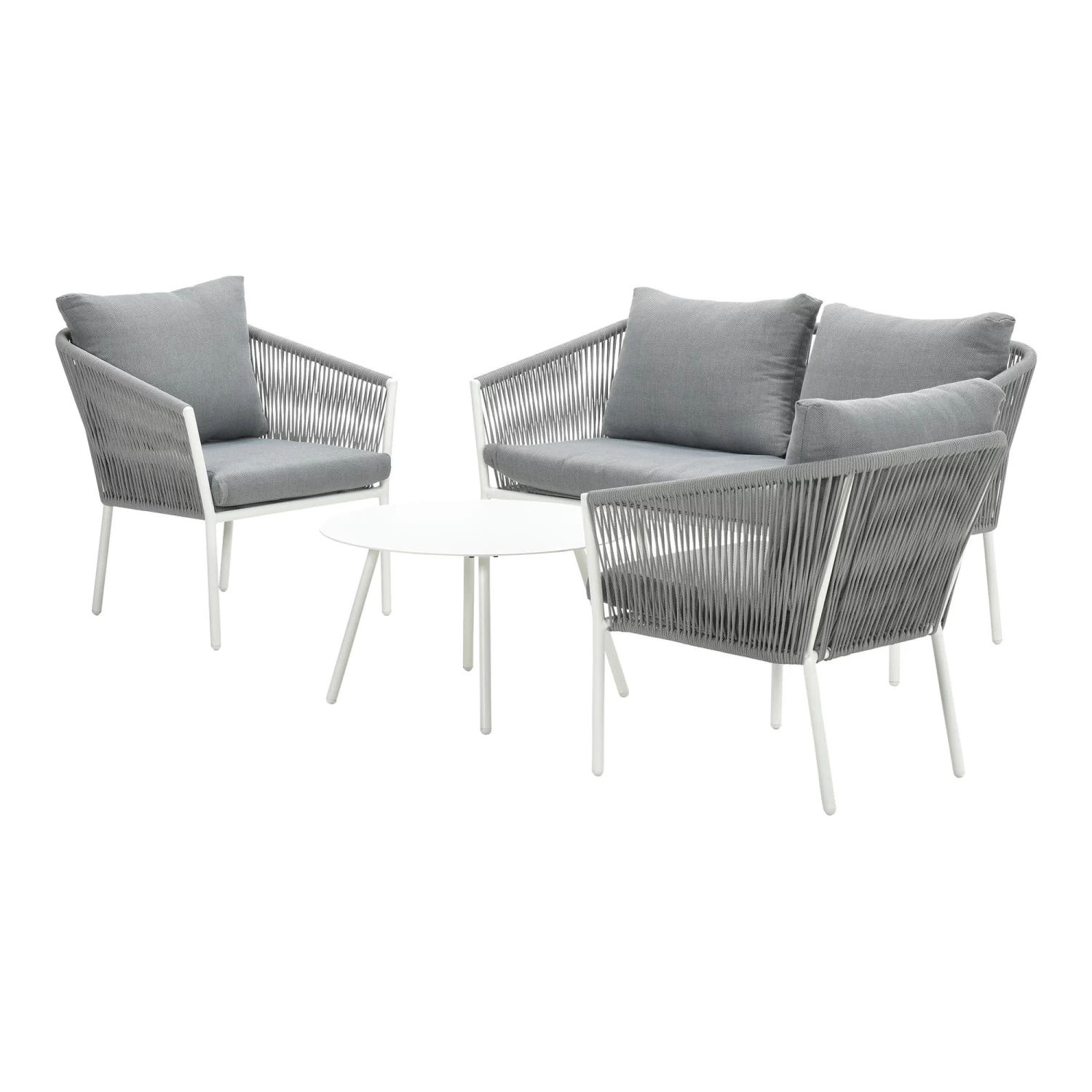 Gefertigt aus pulverbeschichtetem Aluminium in weiß mit hellgrauer Rope Bespannung, handelt es sich um eine sehr edle und trendige Sitzgruppe.