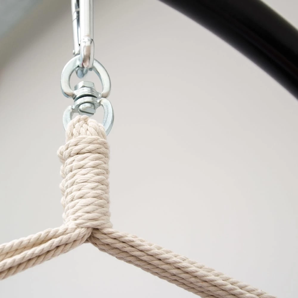 Der robuste, 360° drehbare Metall-Swivel garantiert ein bequemes und drehfreies Sitzen in die richtige Richtung. Gleichzeitig schützt man die Aufhängung gegen zu heftiges Eindrehen durch z.B. ausgelassene Kinder. Die Montage ist schnell gemacht. Einfach einen Dübel + Haken in die Decke schrauben oder an einem Hängestuhlgestell einhaken und selbst ein stabiler Ast im Garten winkt einladend.