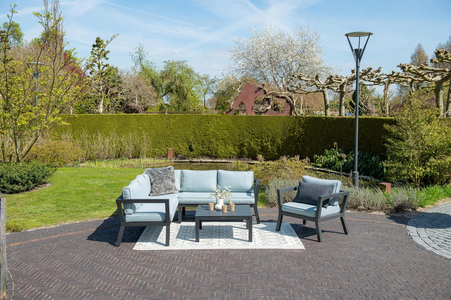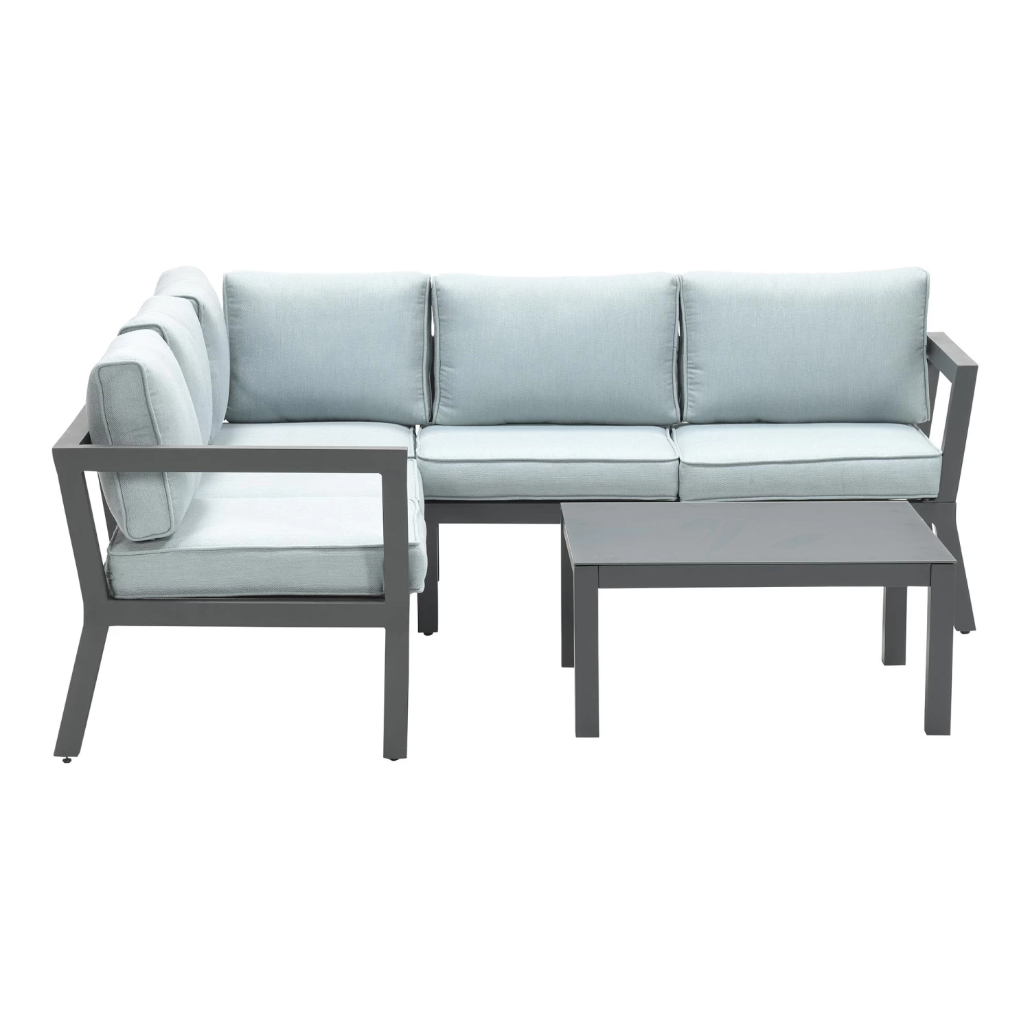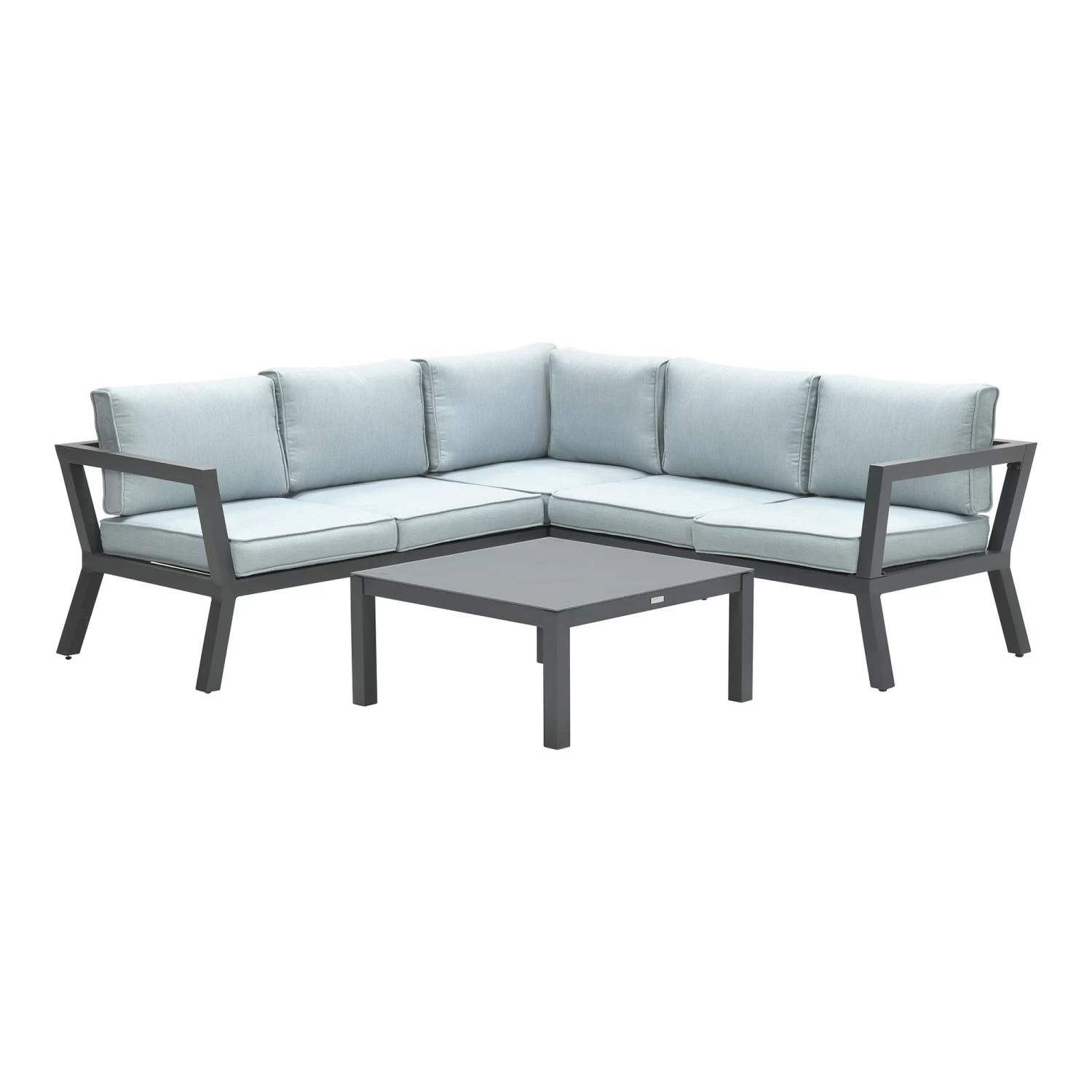 aus einer Eckbank (2 Bankteile) und einem Couchtisch. Das Gestell des Loungesets besteht aus Aluminium.