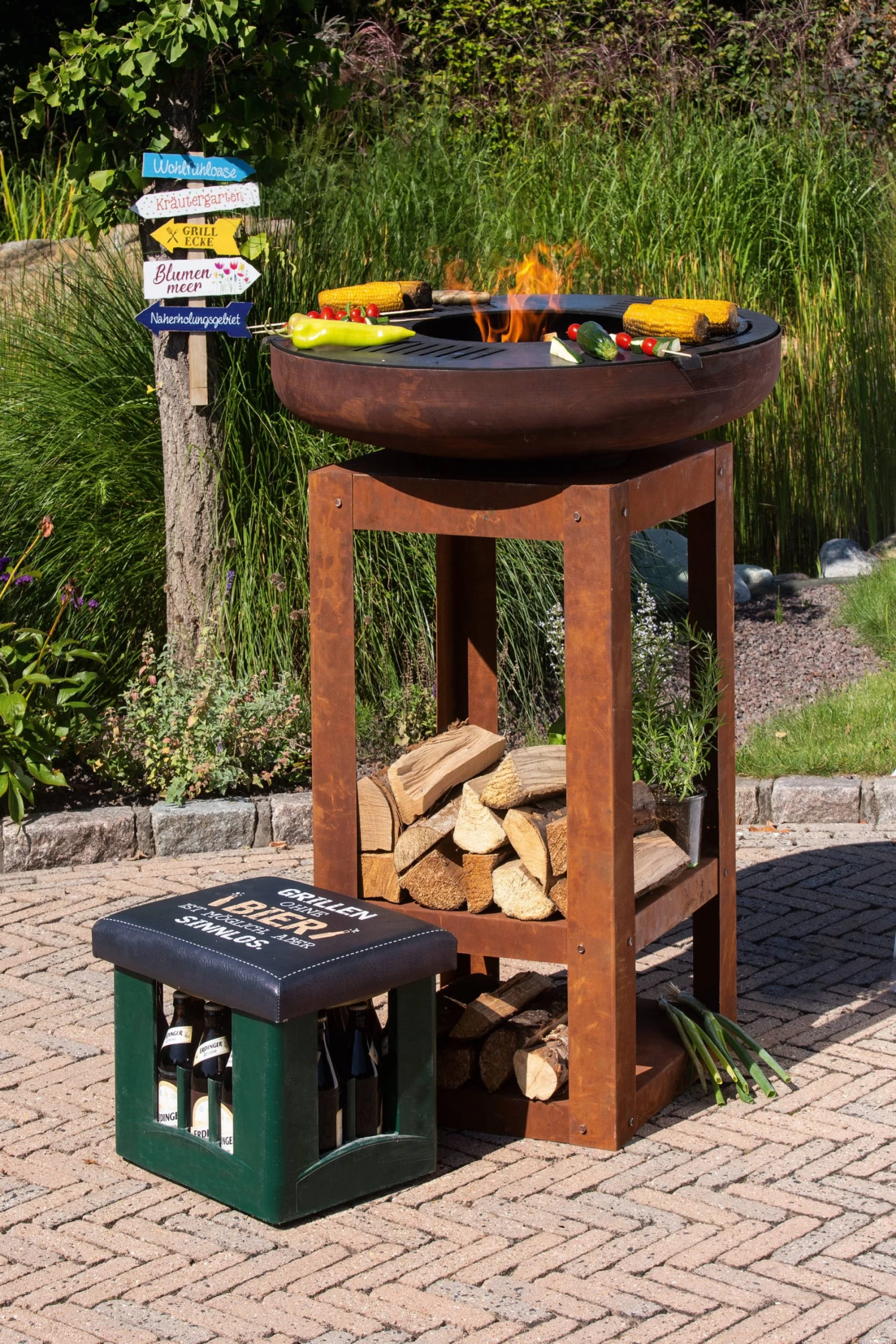 Die Naturrostsäule, auf der der Grill montiert ist, gibt ihm ein rustikales und charmantes Aussehen.